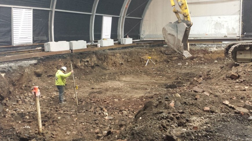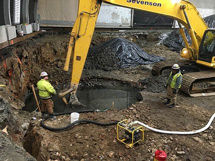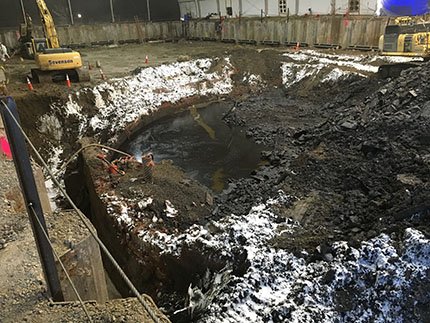 Excavating to install a dewatering sump in the northwest corner of the SOE wall.
