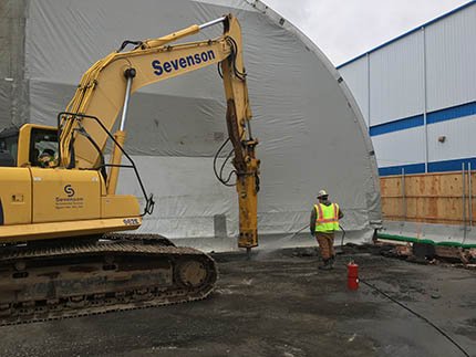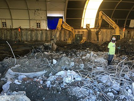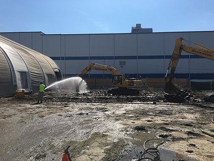 Breaking subsurface concrete structures in the shallow excavation area and applying water and foam for VOC and dust control.