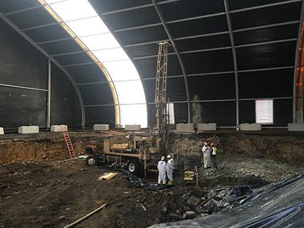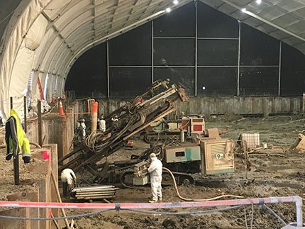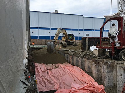Excavating impacted soil and installing (drilling) the tieback in the TCB.