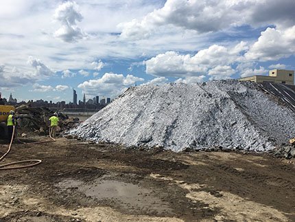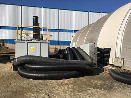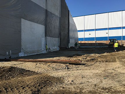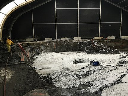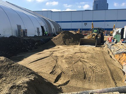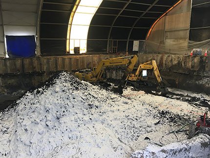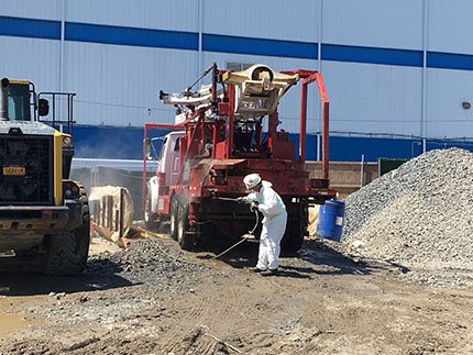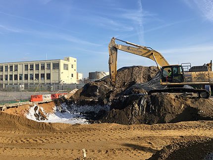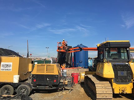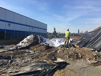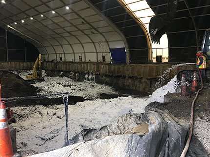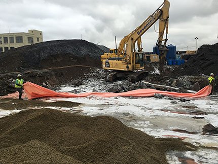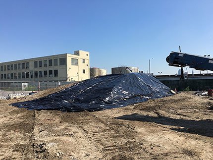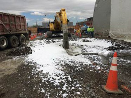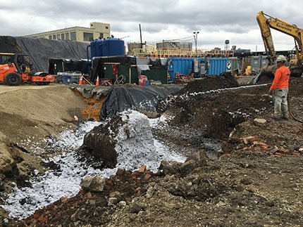 Stockpiling excavated soil and applying foam for VOC and odor control.