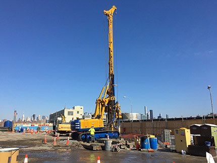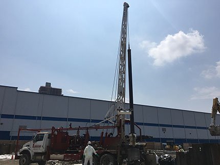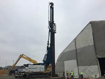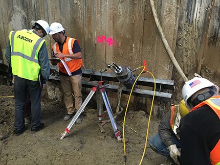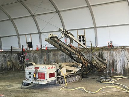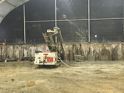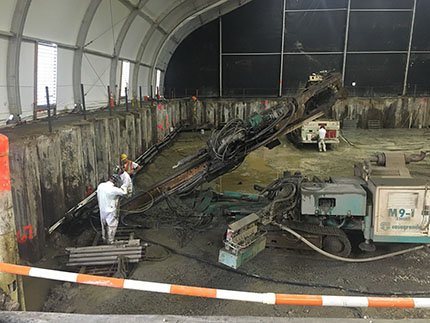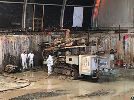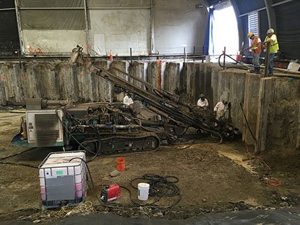 Installing (drilling) tie-backs (external bracing) for the SOE wall in the deep excavation (north and west walls).