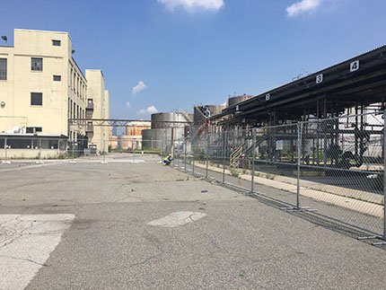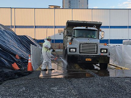 Washing the Site truck tires at the decontamination pad prior to exiting to N. 12th Street.
