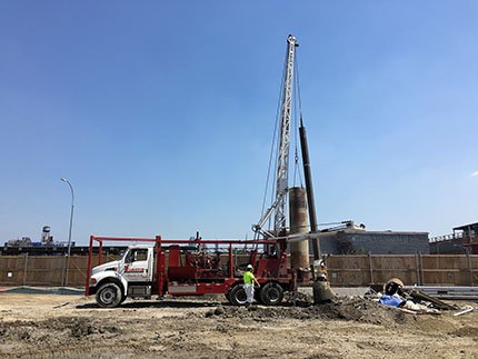 Installing (drilling) the last tieback through the northern SOE sheet pile wall.