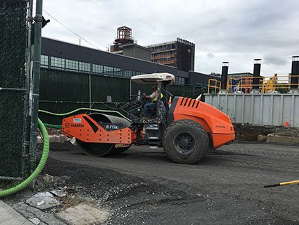 Removing hardscape (asphalt and concrete) for reuse material from the shallow excavation area and applying water for dust control.